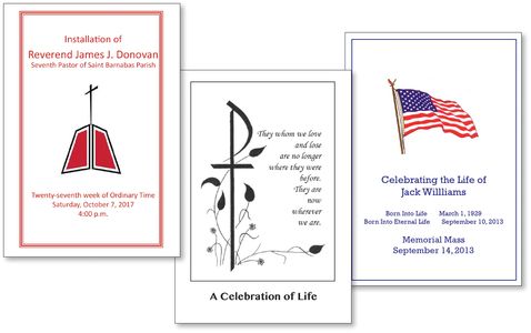 to create lasting, memorable pieces that will long be treasured by you and your family. Our product line includes helping you create and print personalized Mass or religious service programs for weddings, anniversaries, and funerals or memorials.